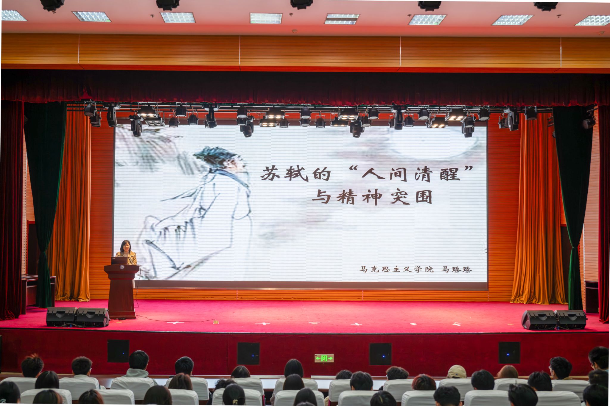 10月30日下午,学院第127场人文与思政讲座在滨海校区图书馆报告厅举行。马克思主义学院马臻臻老师应邀参加并作了题为“苏轼的‘人间清醒’与精神突围”的讲座。2025级400余名学生参加讲座。