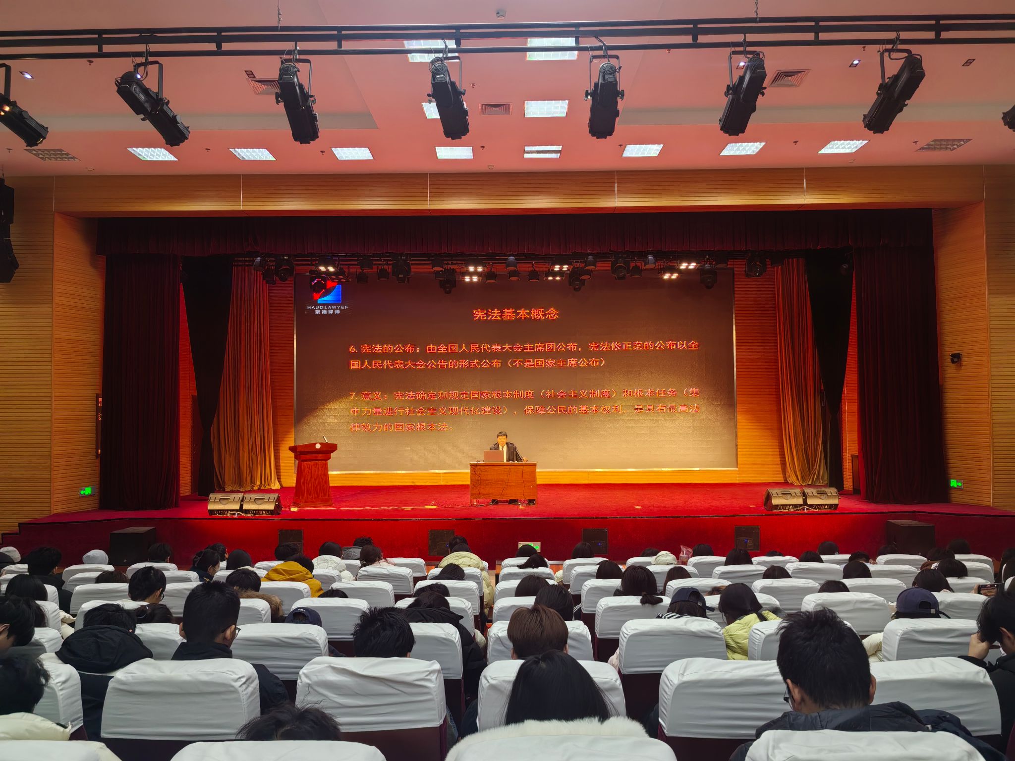 为深入学习宣传贯彻习近平法治思想,推进宪法学习宣传教育,引导师生尊崇、学习、遵守、维护、运用宪法,12月4日,学院举办“国家宪法日”普法教育报告会,马克思主义学院孙天锋老师以“学习宣传贯彻习近平法治思想 推动宪法深入人心”为主题作宣讲报告。马克思主义学院负责同志、思政课教师代表及400余名同学参加报告会。